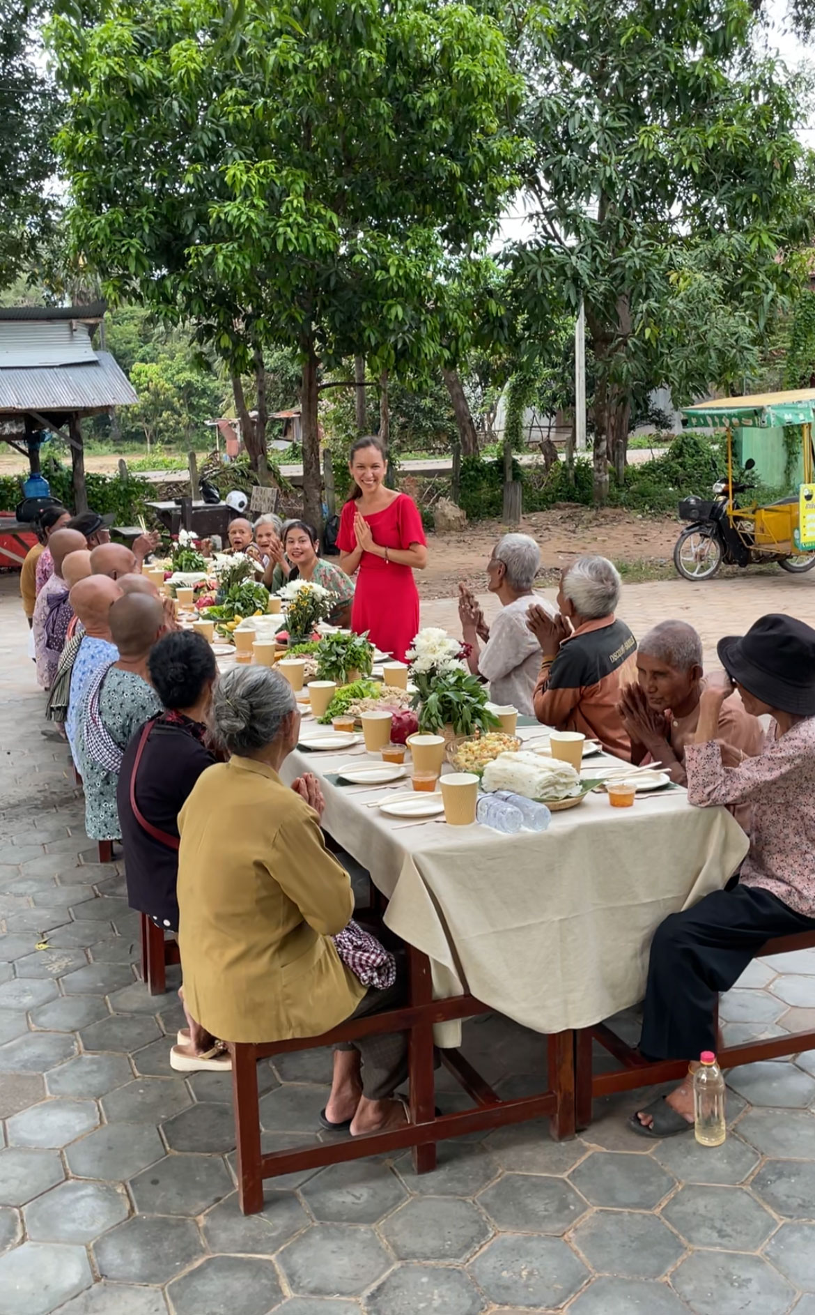 Meanwhile, our driver Ang Tong began bringing the elders to the school in his tuk-tuk, four at a time. Some lived too far to walk — it would take them more than an hour on foot — so we personally picked them up. Those who lived nearby came on their own, smiling and curious.