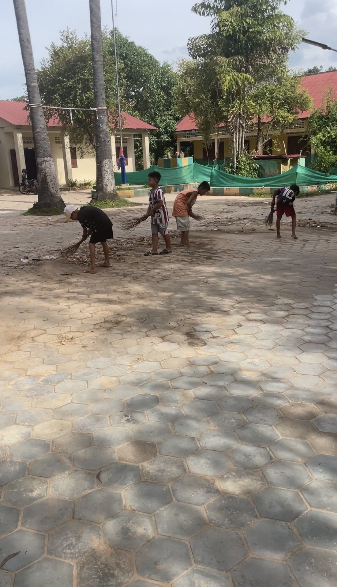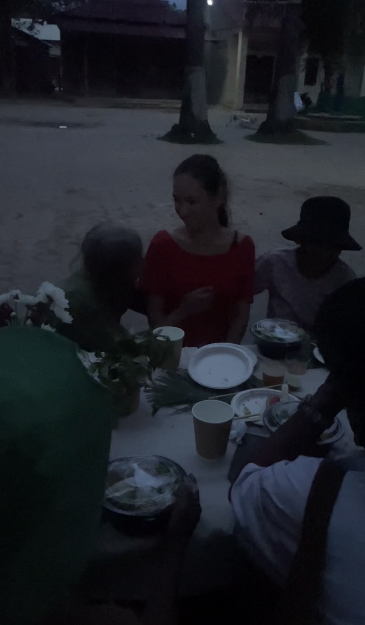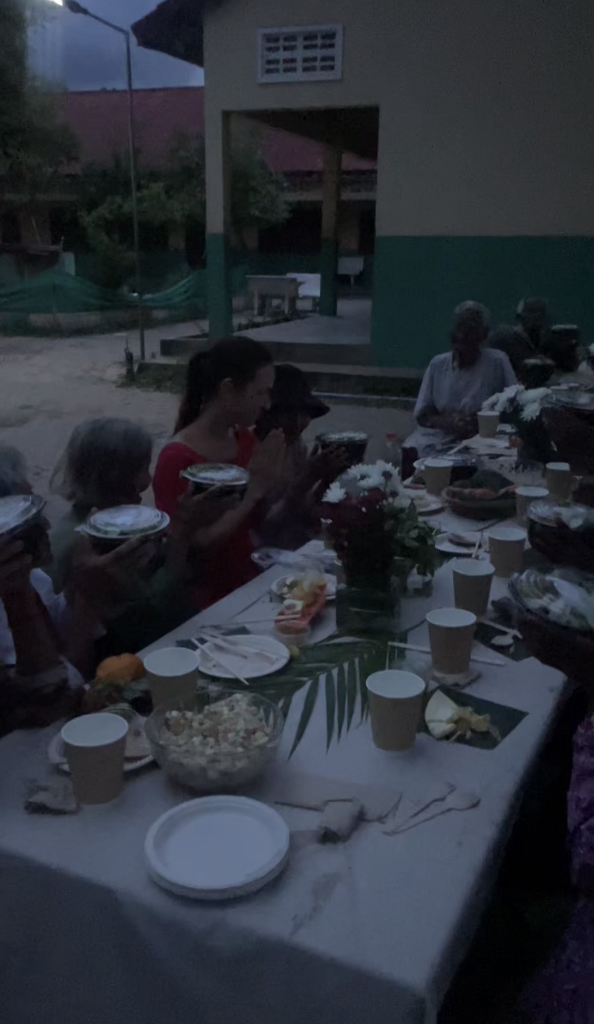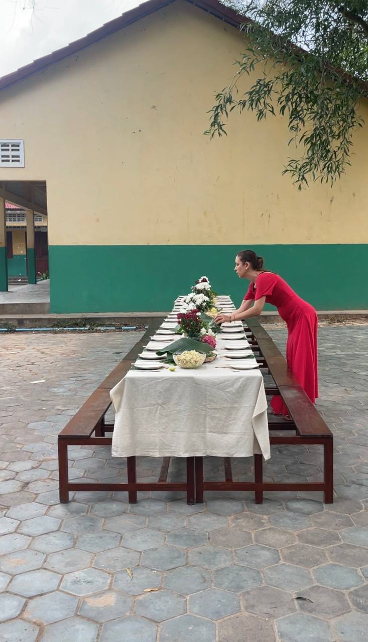 The school director kindly allowed us to host the dinner on their grounds. Children helped sweep the yard and carry out tables, while our team began arranging the food. My son Leo filmed as we prepared, capturing every detail.