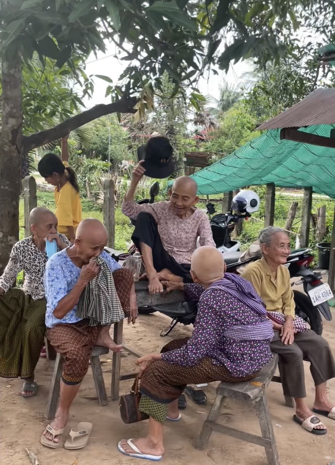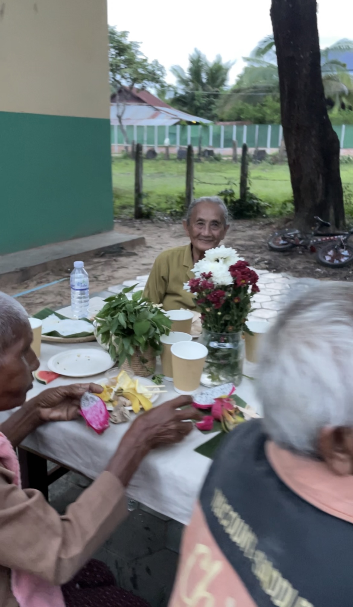 As the elders arrived, they sat in the shade, chatting and laughing while waiting for the rest. Music played — old Cambodian songs from their youth — filling the air with nostalgia.