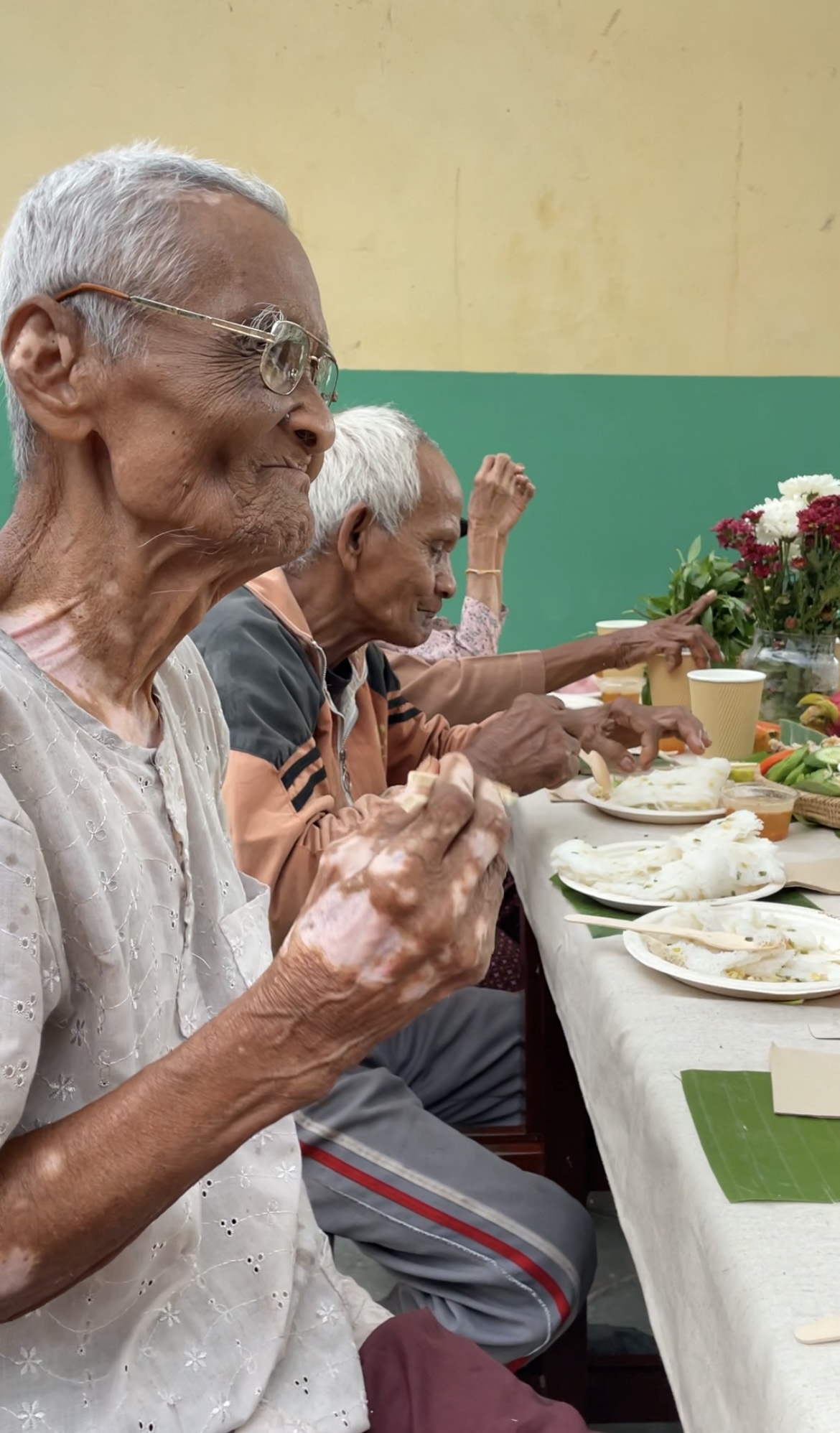 The elders loved the Cambodian dishes, eating with their hands, wrapping herbs, noodles, and meat in banana leaves. They curiously tried the Russian salad too — some said it was unusual, but still smiled as they ate. Laughter and conversations filled the air.