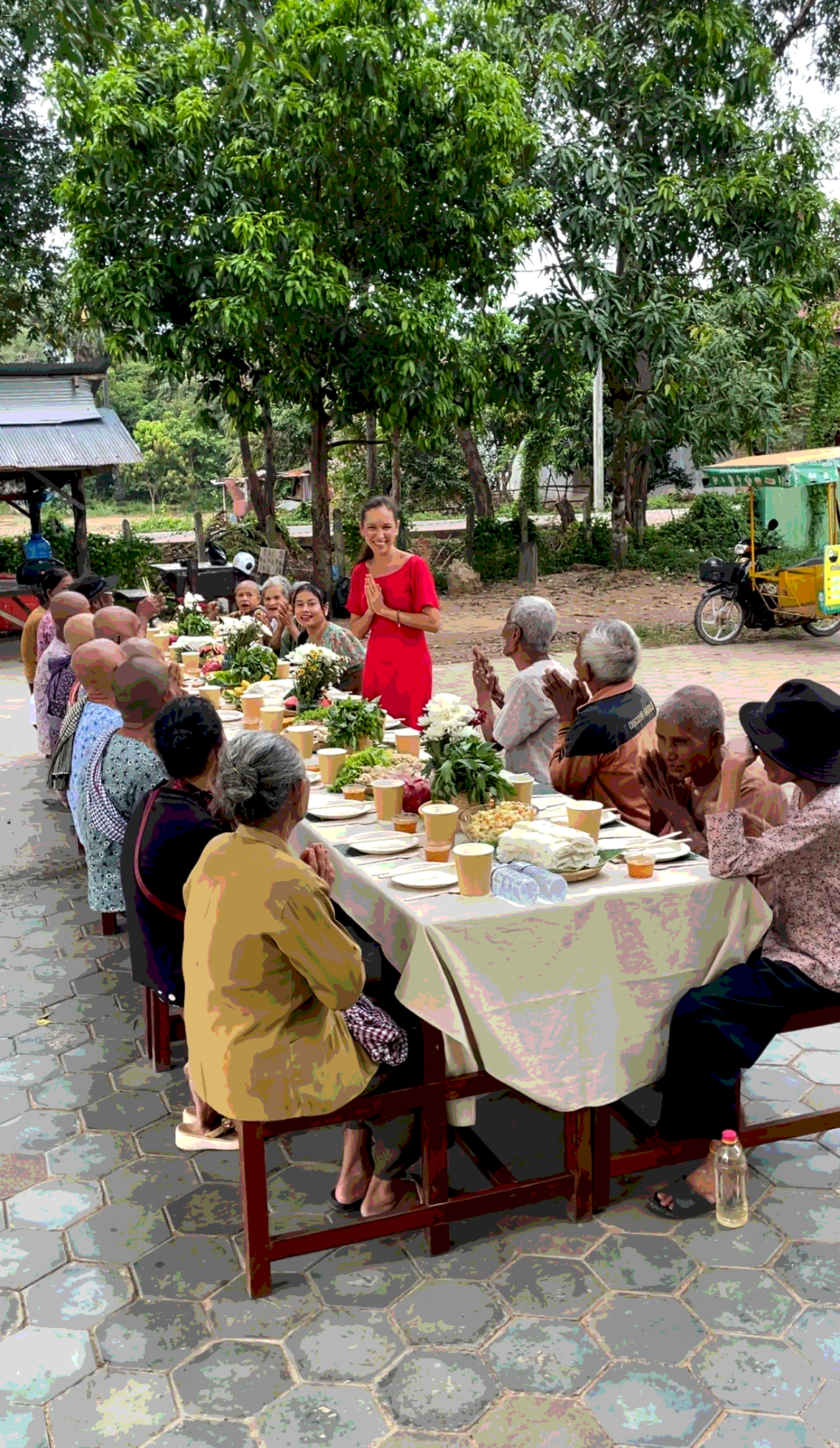 Meanwhile, our driver Ang Tong began bringing the elders to the school in his tuk-tuk, four at a time. Some lived too far to walk — it would take them more than an hour on foot — so we personally picked them up. Those who lived nearby came on their own, smiling and curious.